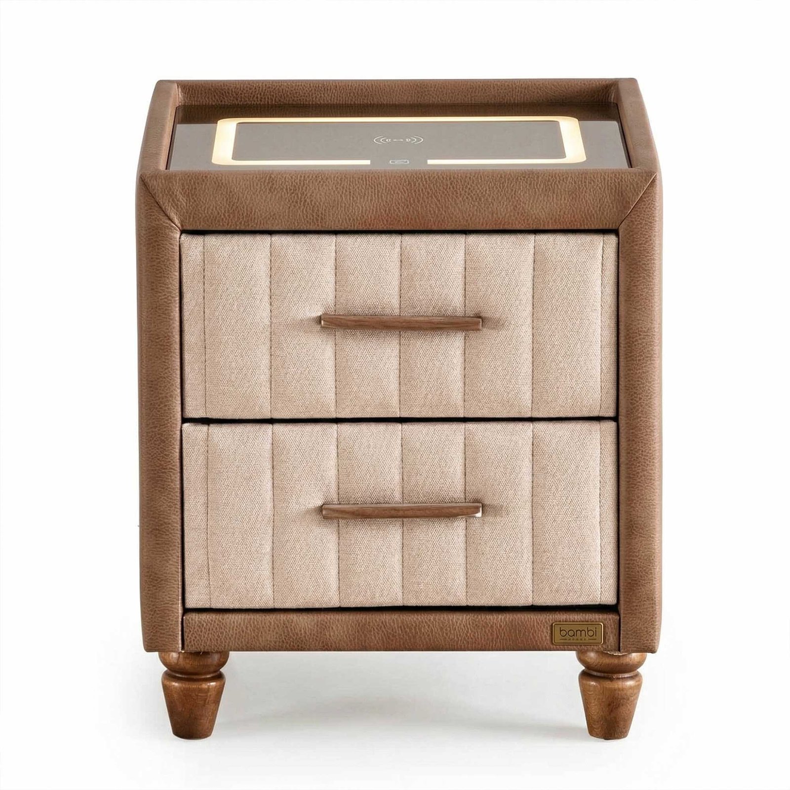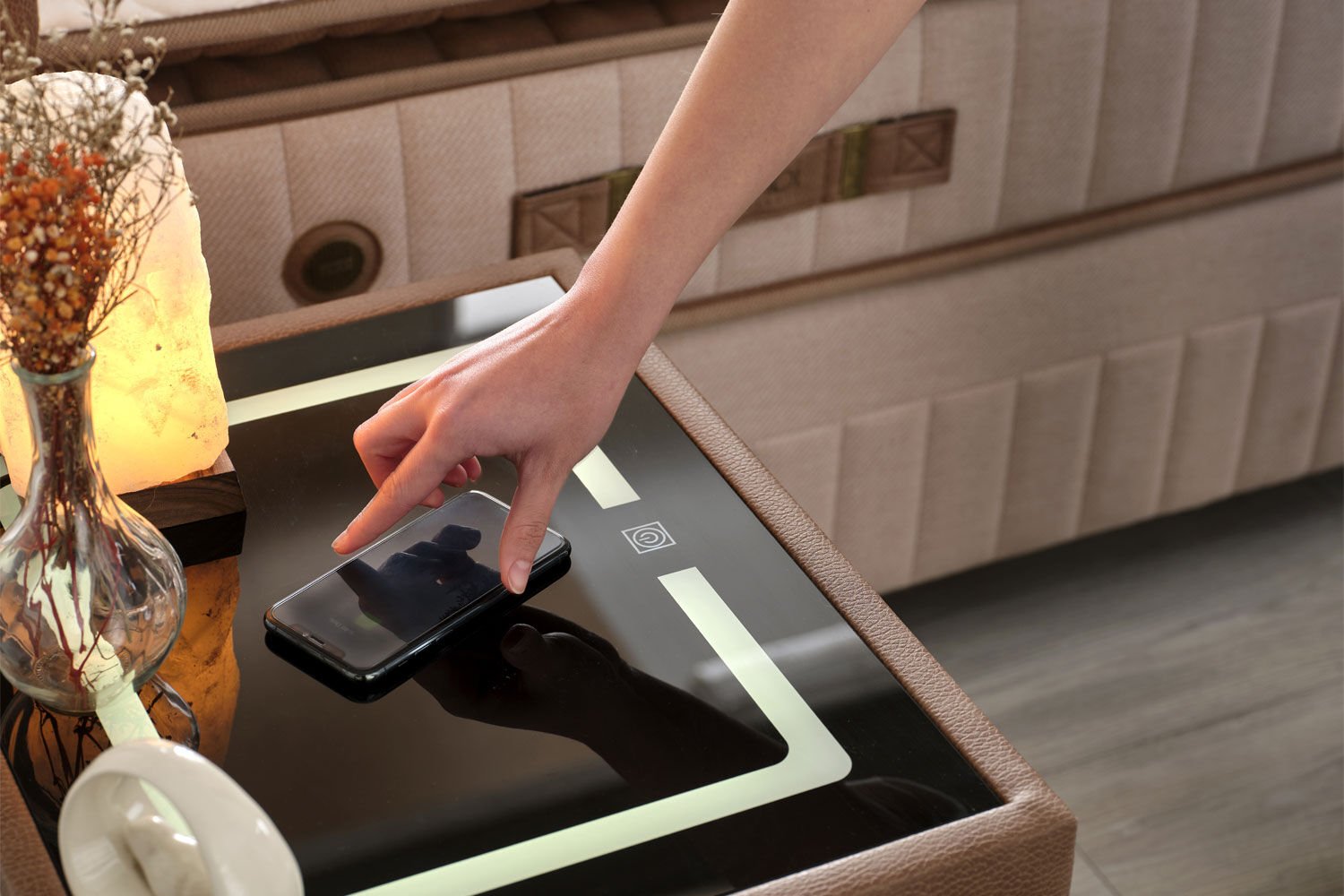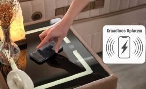 Dankzij het draadloze oplaadpaneel op het Bambi Smart Nachtkastje kunt u uw draadloos oplaadbare telefoon of tablet eenvoudig op het nachtkastje plaatsen om op te laden.